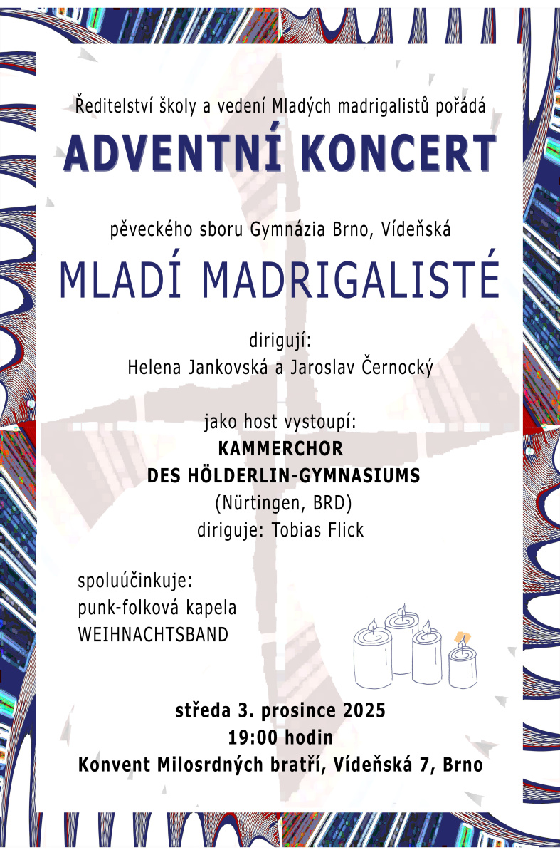 Srdečně Vás zveme na významnou kulturní akci našeho gymnázia, kterou bude Adventní koncert sboru Mladých madrigalistů. Kromě známého pěveckého tělesa se můžete tentokrát těšit i na hostující sbor z partnerské školy z německého Nürtingenu – Kammerchor des Hölderlin-Gymnasium. Dalším hostem bude naše již tradiční studentská punk-folková kapela, tentokrát pod názvem Weihnachtskapele.